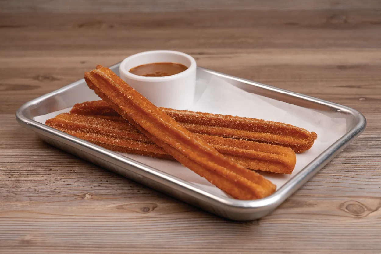 Cinnamon-sugar-coated churros are paired with a rich, caramel dipping sauce, bringing the sweetness to a whole new level for ending your meal on a sweet note